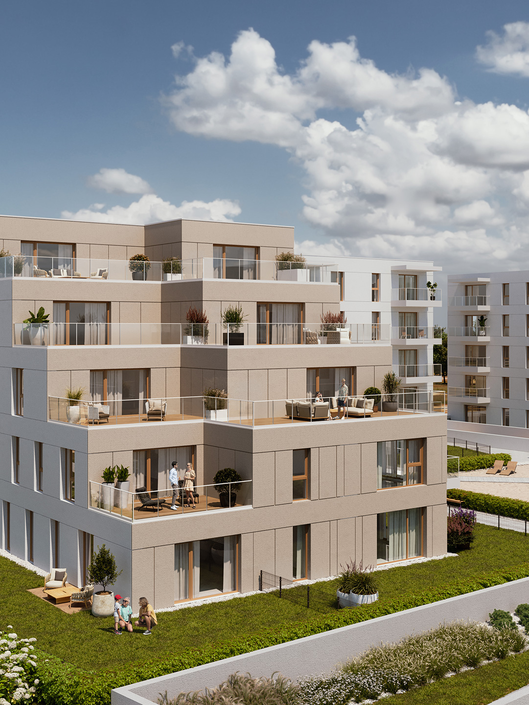 Prywatne, zielone tarasy na parterze o powierzchni do 150 m² oraz wyjątkowe, kaskadowe tarasy (na piętrach I-IV) od 18 m² do 37 m², czy przestronne balkony ze szklanymi balustradami od 7 m², charakterystyczne dla budownictwa Rutkowski Development, zagwarantują upragnioną przestrzeń i pozwolą cieszyć się malowniczym widokiem na park i tereny zielone.